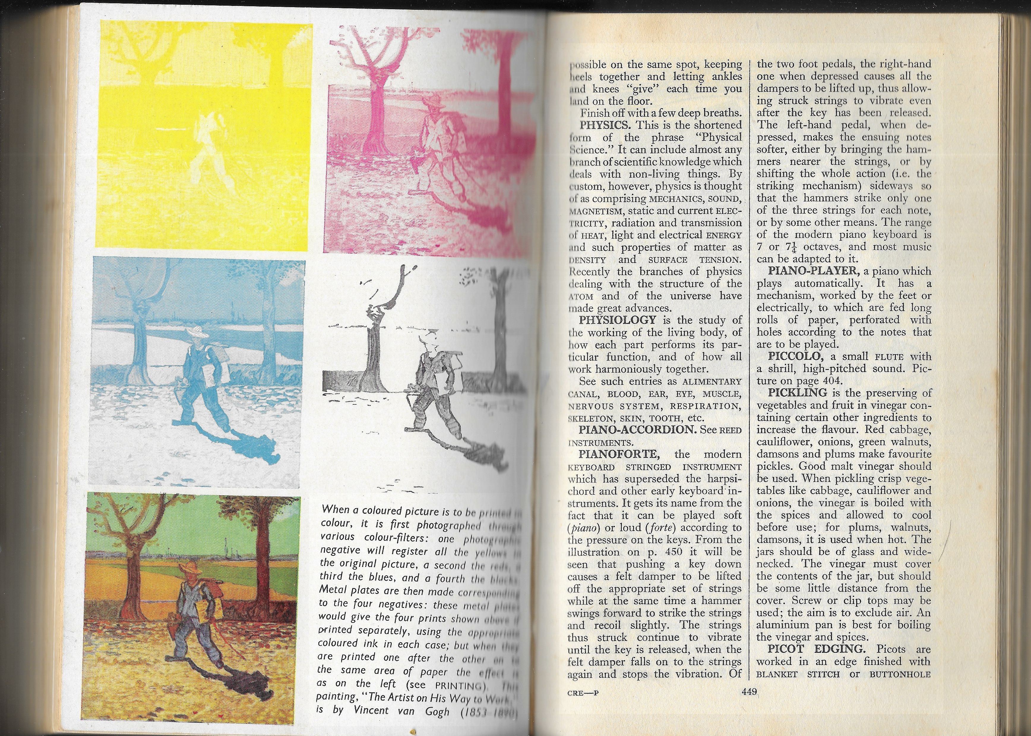 Around 1951, while I was at Merrion House Preparatory School at, I acquired this book. I never knew where my things came from. They might have been dropped off by my grandfather in his 1930s car. This one was mostly boring, told me things I had no context for, but these pages were fascinating me: art, printing and musical instruments
