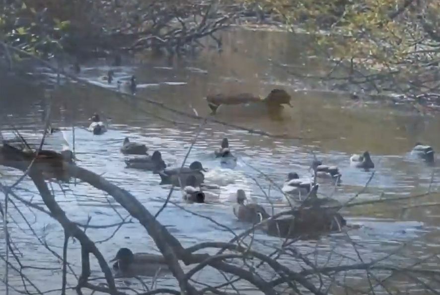Finally my figure-of-eight wandering, tracing the sideways symbol of infinity, brought me back to the pond at Gosling Grove. Four drakes had tattered feathers at their breasts and necks. The duelling was not finished. Any drake getting too close to the lone duck was instantly challenged. Would they go on till nightfall?