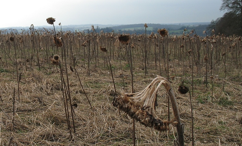 Visits to the sunflower field in Downley, mentioned three times before, have become a private ritual. These unharvested crops survive like invincible peasant crones. In Italian, the sunflower is the girasole or “turn-sun”. Its sun-worship is enabled by fibrous sinews in its “neck”, made of certain cellulose molecules, and these don’t decay as rapidly as fleshier plants. So skeleton sunflowers can stand like ghosts at the end of January.
