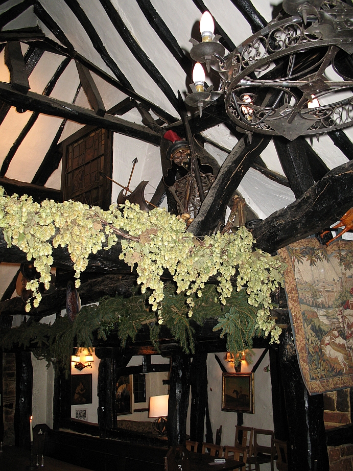 ’Twas a dark and stormy night. We went as planned to The Royal Standard of England, a 900-year-old pub in Buckinghamshire. Above the festooned hops the visitor may descry a skeleton drinker sitting in the rafters, wearing a Roman soldier’s helmet and holding a pewter tankard in his left hand.