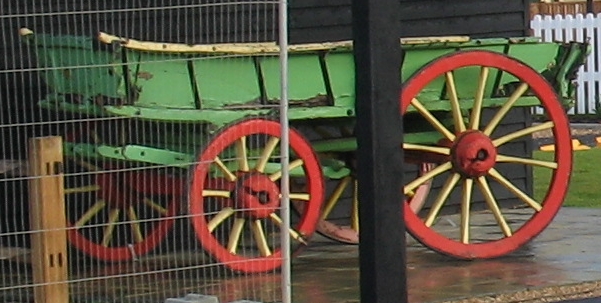 The swinging pub signs and crest show that Peacock Farm is a “tied” pub, supplied by Hall and Woodhouse, the Dorset brewers of Badger Ale. I ought to point out that that this new pub built from old components is no sentimental pastiche or travesty of the English Alehouse. It’s real. The waggon nonchalantly posed under the barn overhang is the genuine rotting article. Looking inside I saw that it had been botched up with various modern boards inside to stop it falling apart. But the use of such a piece of farm machinery to decorate an inn is a venerable tradition.