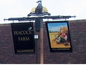 The swinging pub signs and crest show that Peacock Farm is a “tied” pub, supplied by Hall and Woodhouse, the Dorset brewers of Badger Ale. I ought to point out that that this new pub built from old components is no sentimental pastiche or travesty of the English Alehouse. It’s real. The waggon nonchalantly posed under the barn overhang is the genuine rotting article. Looking inside I saw that it had been botched up with various modern boards inside to stop it falling apart. But the use of such a piece of farm machinery to decorate an inn is a venerable tradition.