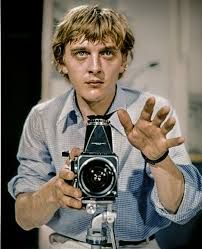 Straight after Raskolnikov, I’ve been letting my soul go for a ride with another reprehensible protagonist: the unnamed photographer of Antonioni’s Blow-up, played by David Hemmings as a bored playboy, who in one scene reminds me of a remark by Marc, commenting on my last: “Every time I ever pointed to a passing girl or woman and, in a commanding voice, said ‘You! Come over here,’ they did so”—as indeed in the scene where Hemmings commands Vanessa Redgrave to sit on the sofa. (NB, it’s Varuschka, not Redgrave, in the photo.) She surprises herself by meekly obeying, but then she’s come to get possession of the incriminating negatives and will stop at nothing. Other dolly-birds of the Swinging Sixties throw themselves at him, anything to be photographed, and they romp and strip in a roll of violet backdrop paper. But this was just the cappuccino froth on the director’s intent: according to the audio commentary, “we impose a narrative on our life, forcing the inchoate reality to carry a meaning”. And then the commentator says, “All meaning is interpersonal,” explaining how Hemmings needs someone else to also see the corpse in the park, to validate that he didn’t just imagine it. The corpse is gone. So he joins in a game of tennis without a ball: the others believe in it, so he can too.