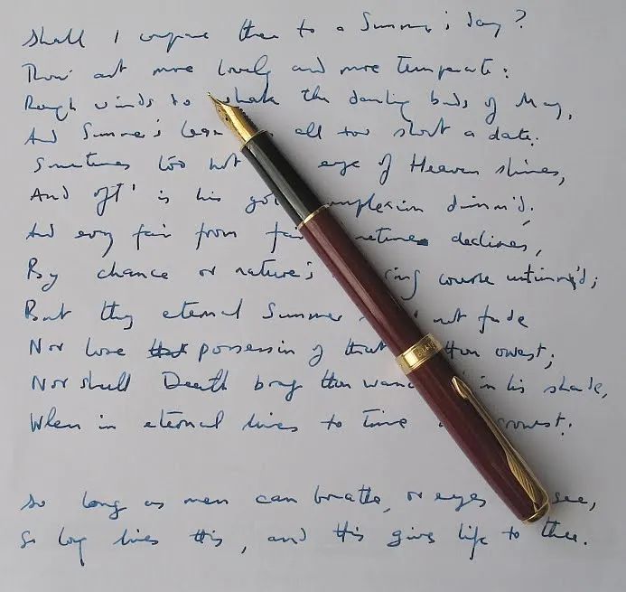 So now I’ve finally bought a more expensive pen, which can feed itself from its own bottle of ink, and doesn’t have to be fed little cartridges. A Parker Sonnet. I don’t want to let it out of my sight. I had the romantic notion that my handwriting would at last become legible and effortlessly calligraphic. Mmmm. Perhaps it will, one Summer’s day, before its gold complexion is dimm’d.