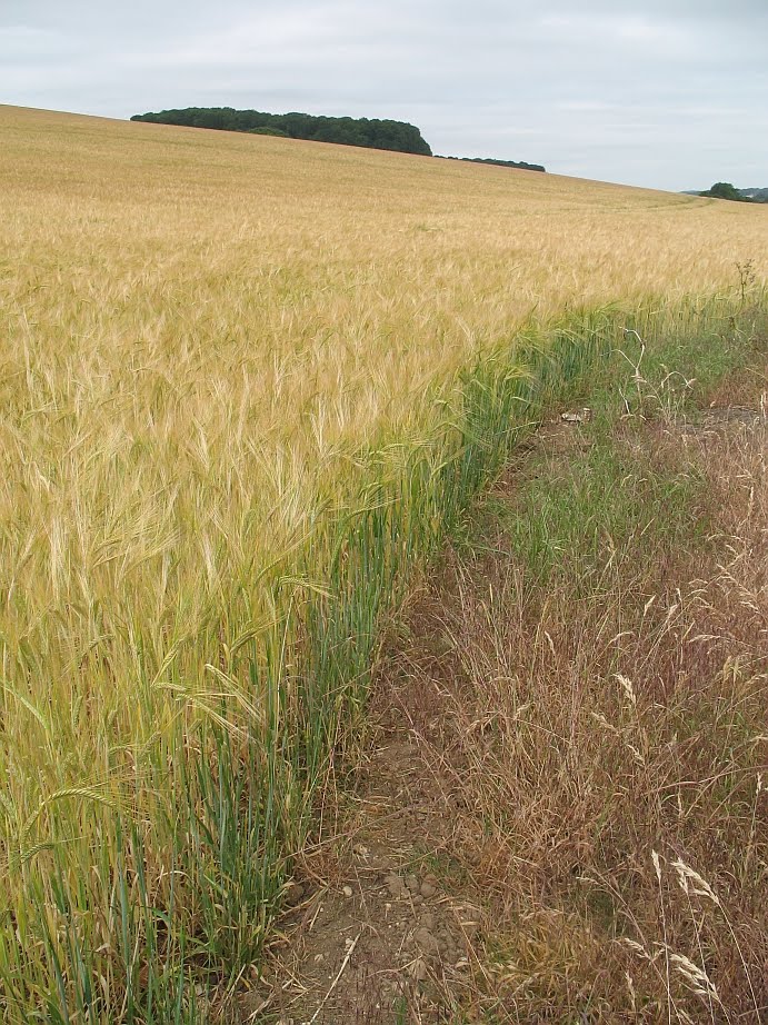 Edge of wheat field. A swathe was mown at the edge of the field, cutting into the wheat, whose stalks have grown since then