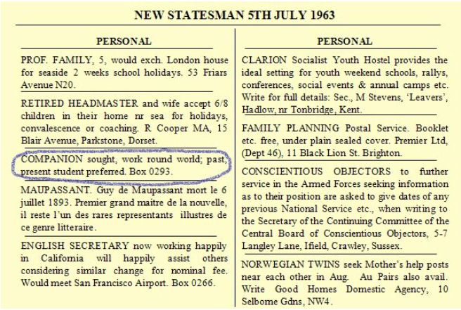 In July 1963, I’d just graduated as a Bachelor of Arts. But I’d lost everything else: my student status, friends, my girlfriend, any plans for the future. There was nothing on my landscape but a vast crater of loss. One day I bought a copy of the New Statesman at New Cross Tube Station, South East London, a few minutes after walking out of a training course for VSO (Voluntary Service Overseas). They were going to send me to what was then called French Guinea, in West Africa. I will not describe the particular humiliation which prompted my walk-out. At twenty-one, I lived in dreams. Apart from book-learning, which I was good at, my only achievement was to have survived five months in France and Italy on my own and penniless.