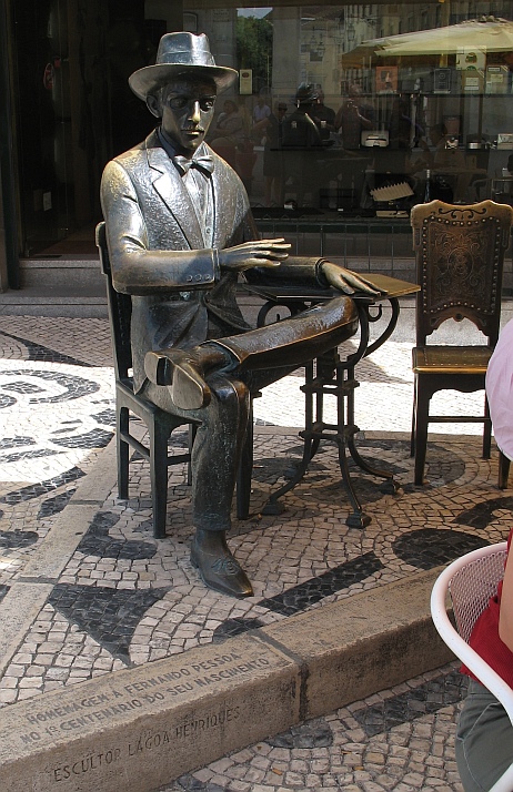 We found an international bookshop with some volumes by Fernando Pessoa in the window. I’ve written before about this famous Lisbon writer, my literary idol. I enquired about his statue, which I hoped to see whilst we were in the city. It was a few yards away. Hospitable even preserved in bronze, he keeps an empty chair, where one can sit beside him, and be photographed together.