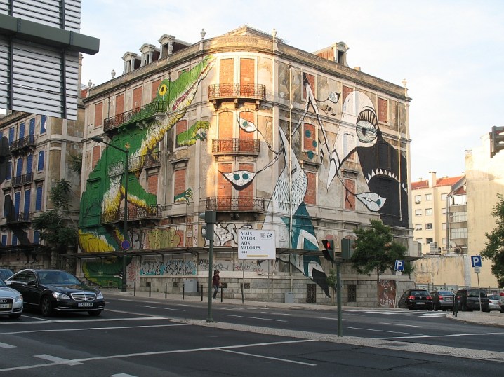 Uninhibited art is everywhere in Lisbon, like here, turning a derelict building into a statement. I don’t know what it’s trying to say, though.