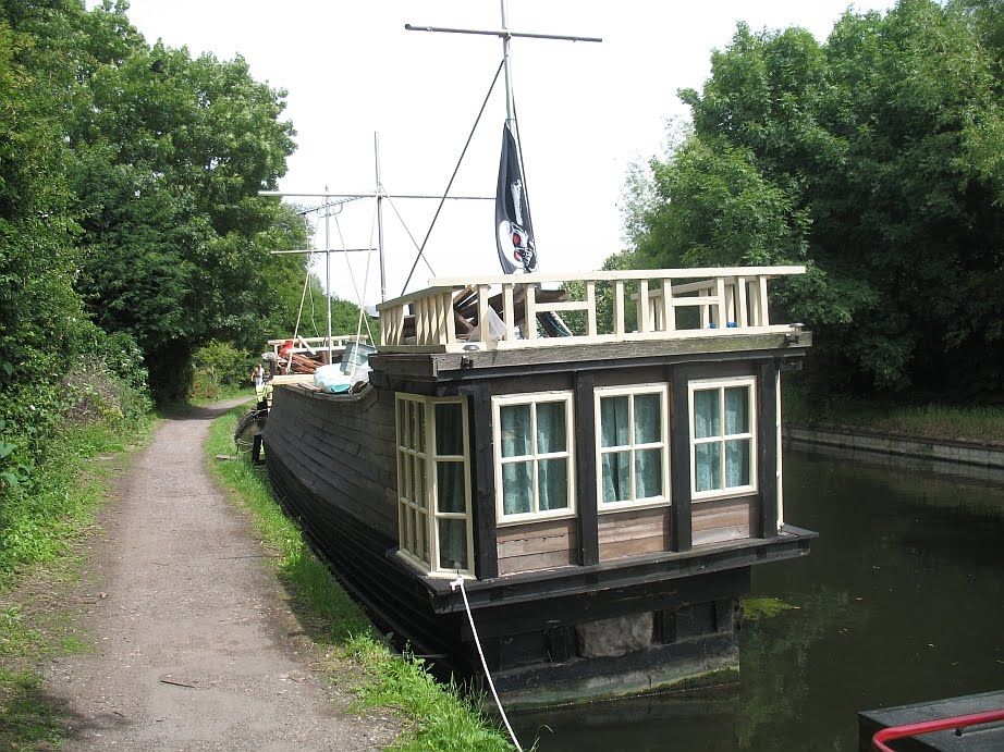 As I wandered down the towpath I encountered a barge, faked-up into the swagger of a pirate ship, complete with skull-and-crossbones flag. Barges are moored sometimes permanently along the canal sides. Once used for freight they’re now adapted as holiday homes, or even permanent residences: expressions of their owners’ dreams, or even their owner’s children’s dreams.