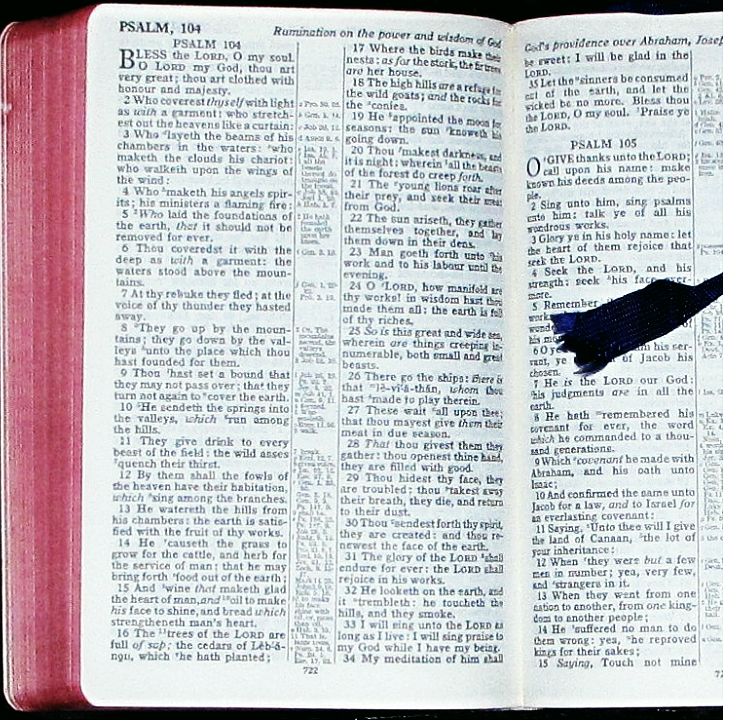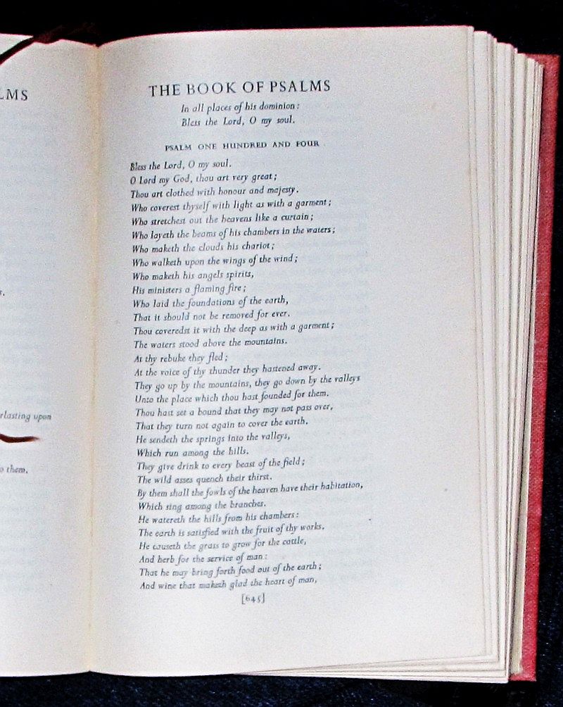 Now I turn to the middle of the book, to “The Book of Psalms: an anthology of sacred poetry”; and find Psalm 104, which blesses the Lord for this earth in such tender detail that it provides nourishment for the soul, quite independently of mere religion. Nourishment almost literally, for I can imagine it keeping someone alive in extremis, when no other succour is yet available; filling a gap left by humanism, science and hope for progress.
