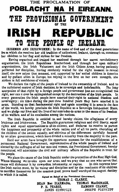 These things don’t get forgotten, and around the turn of the century there occurred a Celtic Revival, claiming pride in Ireland’s language and legends, its artists and poets. A Home Rule movement gathered momentum with much debate, but the paternalistic British Government didn’t think the Irish were ready for that, not to mention certain vested interests. On Easter Monday, 1916, a poster was put up all over Dublin, proclaiming a republic. A copy of this was the first thing I saw when I entered the jail. I asked what happened to its signatories, and later found out, in precise detail. Note especially the two names at the bottom of the poster.