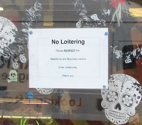 Loiter : v. to linger or hang around in a public place or business where one has no particular or legal purpose. In many states, cities, and towns there are statutes or ordinances against loitering by which the police can arrest someone who refuses to “move along.” There is a question as to whether such laws are constitutional. However, there is often another criminal statute or ordinance which can be applied specifically to control aggressive begging, soliciting prostitution, drug dealing, blocking entries to stores, public drunkenness, or being a public nuisance. (The Free Dictionary)