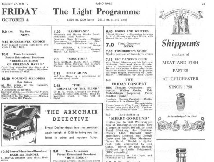 Thereafter I read everything that came my way. I’d arrived from Australia to an England of bomb sites and frugality, the War being only just over. In my grandmother’s house toilet paper was not supplied, only sheets of appropriate size torn from old copies of the Radio Times. I would never use a sheet without first reading its contents both sides. The text was ideal for this purpose, mainly consisting of brief listings of the three wireless channels: The Home Service, The Light Programme, The Third Programme; corresponding respectively to talk; light music and entertainment; classical music, high-brow talk and literature. By today’s standards, all three were high-brow, for the BBC believed passionately in public service, support for the arts and the role of the educated classes in edifying the masses. You could say I was touched by the highest culture at a tender age, and for that matter in a tender place.