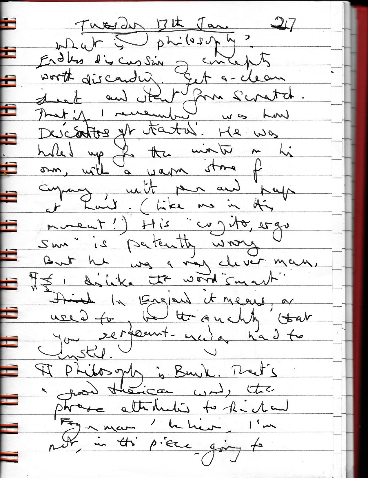 …endless discussion of concepts worth discarding. Get a clean sheet, and start from scratch. That, if I remember, was how Descartes got started. He holed up on his own in a cold winter with only a wood stove for company, along with pen, paper and ink. (like me at this moment!). His “Cogito, ergo Sum” is patently wrong, but he was a clever man.*