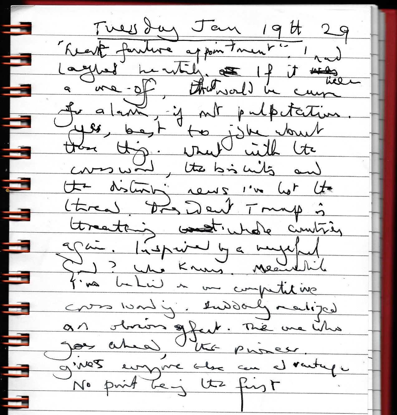 McVitie’s Rich Tea biscuits, Yorkshire Tea—gladdening when taken together, after a night’s seldom-interrupted sleep. An all-purpose remedy when you reach a certain age. I’m at this age, and am certain. On Thursday 15th at 9am the surgery’s booked me in for an “annual heart failure review” appointment. I laughed heartily. If it was a one-off, that would be cause for alarm, if not palpitations.
